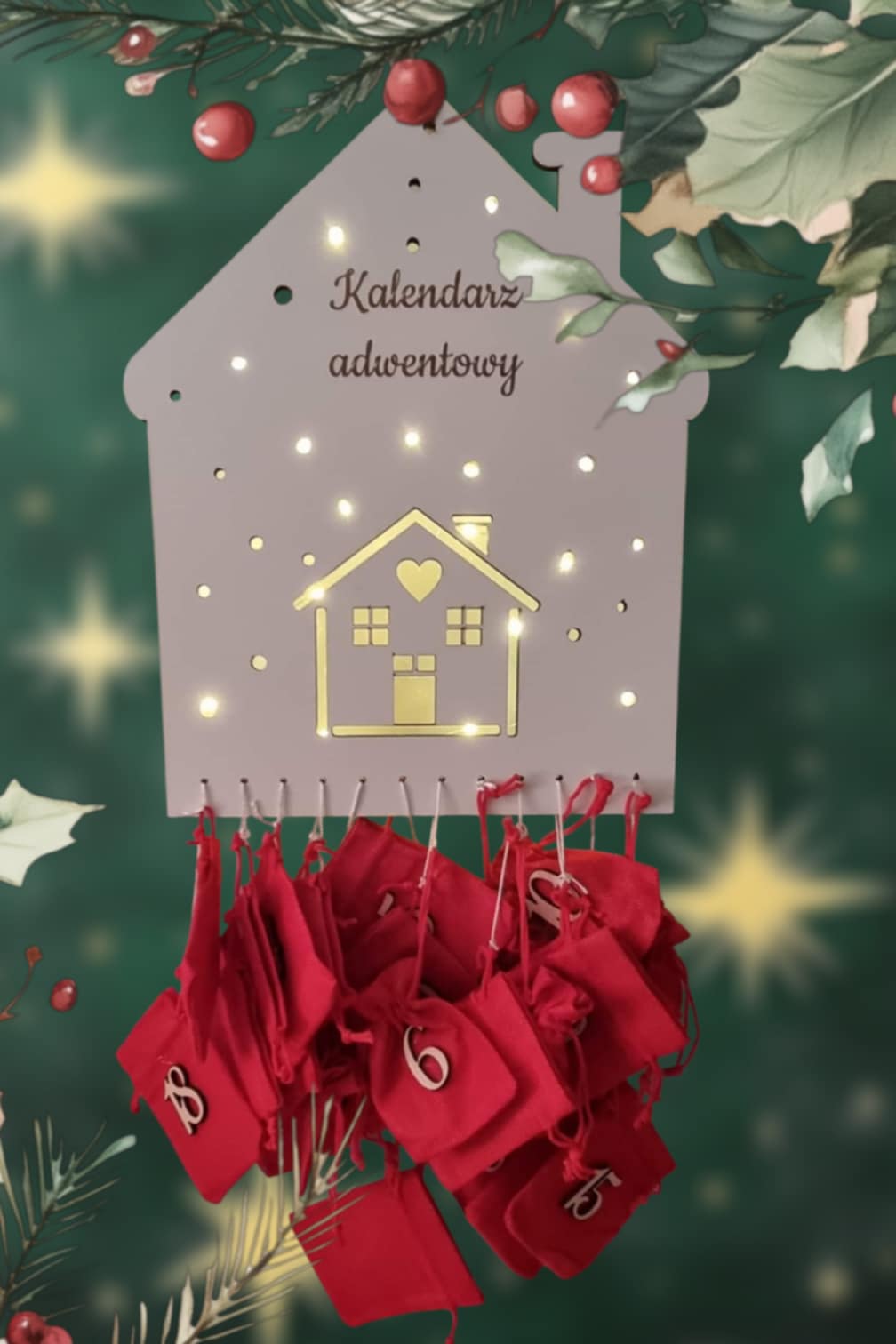 Stwórz magiczną atmosferę świąt z naszym kalendarzem adwentowym! Świecący domek z subtelnymi, złotymi detalami i 24 eleganckimi, czerwonymi woreczkami to idealny sposób na odliczanie dni do Bożego Narodzenia. Każdy woreczek czeka, by skryć małe niespodzianki i codziennie cieszyć Twoich bliskich.